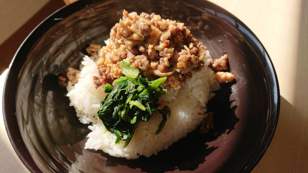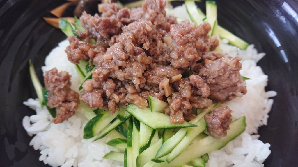 三食丼のお味付で猪ミンチ肉をそぼろ煮にして、